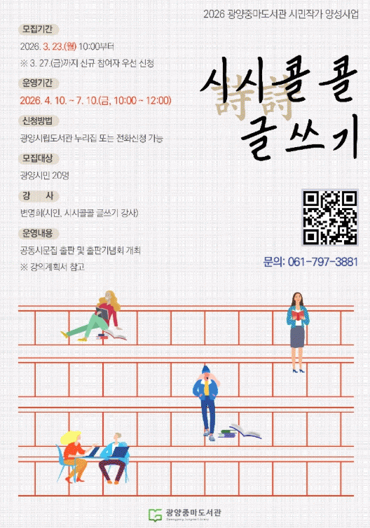 [¹Ìµð¾îÀü³² ÀÓ¼º¿Ï ±âÀÚ] ±¤¾çÁ߸¶µµ¼°üÀº ½Ã¹ÎÀÇ Ã¢ÀÛ ¿ª·®À» ³ôÀÌ°í ¹®ÇРȰµ¿ Âü¿© ±âȸ¸¦ ³ÐÈ÷±â À§ÇØ 1ÀÎ 1Ã¥ '½Ã¹ÎÀÛ°¡ ¾ç¼º»ç¾÷'ÀÇ Çϳª·Î ¡®½Ã½Ã(ãÌãÌ)ÄÝÄÝ ±Û¾²±â¡¯ ÇÁ·Î±×·¥À» ¿î¿µÇÑ´Ù. ¡®½Ã½ÃÄÝÄÝ ±Û¾²±â¡¯´Â ½Ã¸¦ ÀÐ°í ¾²¡¦