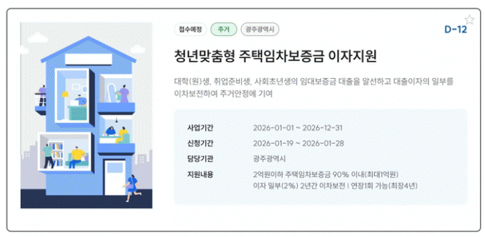 [¹Ìµð¾îÀü³² Á¦°¥´ëÁ¾ ±âÀÚ]±¤ÁÖ±¤¿ª½Ã´Â ¹«ÁÖÅà û³âÀÇ Áְźñ ºÎ´ã ¿Ïȸ¦ À§ÇÑ Ã»³â¸ÂÃãÇü ÁÖÅÃÀÓÂ÷º¸Áõ±Ý ÀÌÀÚÁö¿ø »ç¾÷ ´ë»óÀÚ¸¦ 19ÀϺÎÅÍ ¸ðÁýÇÑ´Ù. ÀÌ »ç¾÷Àº û³âÀÌ Àü¡¤¿ù¼¼ ÀÓÂ÷º¸Áõ±ÝÀ» ´ëÃâÇÒ ¶§ ¹ß»ýÇÏ´Â ÀÌÀÚ¸¦ ÀϺΠÁö¿ø¡¦