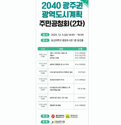 [¹Ìµð¾îÀü³² Á¦°¥´ëÁ¾ ±âÀÚ]±¤ÁÖ±¤¿ª½Ã¿Í Àü¶ó³²µµ´Â 5ÀÏ Àü³² ³ªÁֽà µ¿½Å´ëÇб³ Áß¾Óµµ¼°ü µ¿°È¦¿¡¼ ¡®2040 ±¤ÁÖ±Ç ±¤¿ªµµ½Ã°èȹ(¾È) °øÃ»È¸¡¯¸¦ °³ÃÖÇÑ´Ù. À̳¯ °øÃ»È¸´Â ¹Ì·¡Â÷±¹°¡»ê´ÜÀÌ ±¹°¡Àü·«»ç¾÷À¸·Î È®Á¤µÊ¿¡ µû¶ó À̸¦ ±¤¡¦