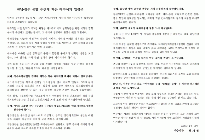 [¹Ìµð¾îÀü³² ÀüÇü¼º ±âÀÚ]ÃÖ±Ù Àü³²¡¤±¤ÁÖ ÇàÁ¤ÅëÇÕ ³íÀǰ¡ º»°Ýȵǰí ÀÖ´Â °¡¿îµ¥, ¿©¼ö½Ã(½ÃÀå Á¤±â¸í)°¡ °ü·ÃÇØ ÅëÇÕÀÇ µ¿µîÇÑ ÁÖü·Î¼ °øµ¿ ¼ºÀå ±â¹ÝÀ» ´ãº¸ÇÒ ¡®5´ë ÇÙ½É °úÁ¦¡¯¸¦ Á¤ºÎ¿¡ °ø½Ä Á¦¾ÈÇß´Ù. Á¤ ½ÃÀåÀº 15ÀÏ ÀÔÀå¹®¡¦