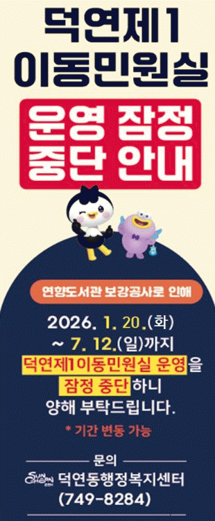 [¹Ìµð¾îÀü³² ÀÓ¼º¿Ï ±âÀÚ]¼øÃµ½Ã ´ö¿¬µ¿ÇàÁ¤º¹Áö¼¾ÅÍ´Â ¿¬Çâµµ¼°ü ³»¿¡ ¿î¿µ ÁßÀÎ ´ö¿¬µ¿ Á¦1À̵¿¹Î¿ø½ÇÀÌ µµ¼°ü ³»Áø¼º´É º¸°°ø»ç ½ÃÇà¿¡ µû¶ó ¿À´Â 1¿ù 20ÀϺÎÅÍ 7¿ù 12ÀϱîÁö ¿î¿µÀ» ÀáÁ¤ Áß´ÜÇÑ´Ù°í ¹àÇû´Ù. ¿¬Çâµµ¼°üÀº °ø»ç¸¦¡¦