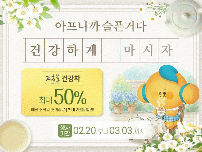 [¹Ìµð¾îÀü³² Á¦°¥´ëÁ¾ ±âÀÚ]°íÈﱺÀÌ ¿î¿µÇÏ´Â ¿Â¶óÀÎ ³ó¼öÃàÆ¯»ê¹° ¼îÇθô ¡®°íÈï¸ô¡¯Àº ȯÀý±â °Ç° °ü¸®¸¦ µ½±â À§ÇÑ ¡®°Ç°Â÷ ±âȹÀü¡¯À» ¿À´Â 2¿ù 20ÀϺÎÅÍ 3¿ù 3ÀϱîÁö ÁøÇàÇÑ´Ù°í ¹àÇû´Ù. À̹ø ±âȹÀüÀº Å« Àϱ³Â÷¿Í ¹Ì¼¼¸ÕÁö µî¡¦