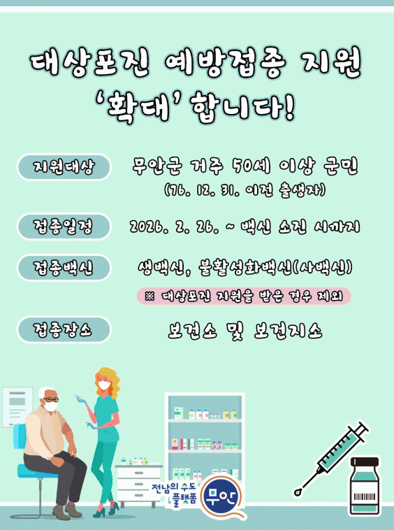 [¹Ìµð¾îÀü³² ±èÆÇ±¹ ±âÀÚ]¹«¾È±ºÀÌ ¿À´Â 23ÀϺÎÅÍ ´ë»óÆ÷Áø ¿¹¹æÁ¢Á¾ Áö¿ø ´ë»óÀ» È®´ëÇÑ´Ù. ±âÁ¸ »ý¹é½Å¿¡ ´õÇØ À¯ÀüÀÚÀçÁ¶ÇÕ¹é½Å(»ç¹é½Å)±îÁö Áö¿ø ¹üÀ§¸¦ ³ÐÇô 50¼¼ ÀÌ»ó ±º¹ÎÀÇ Á¢Á¾ ¼±ÅñÇÀ» °ÈÇÑ´Ù´Â ÃëÁö´Ù. Áֹεî·Ï»ó 1³â ÀÌ¡¦